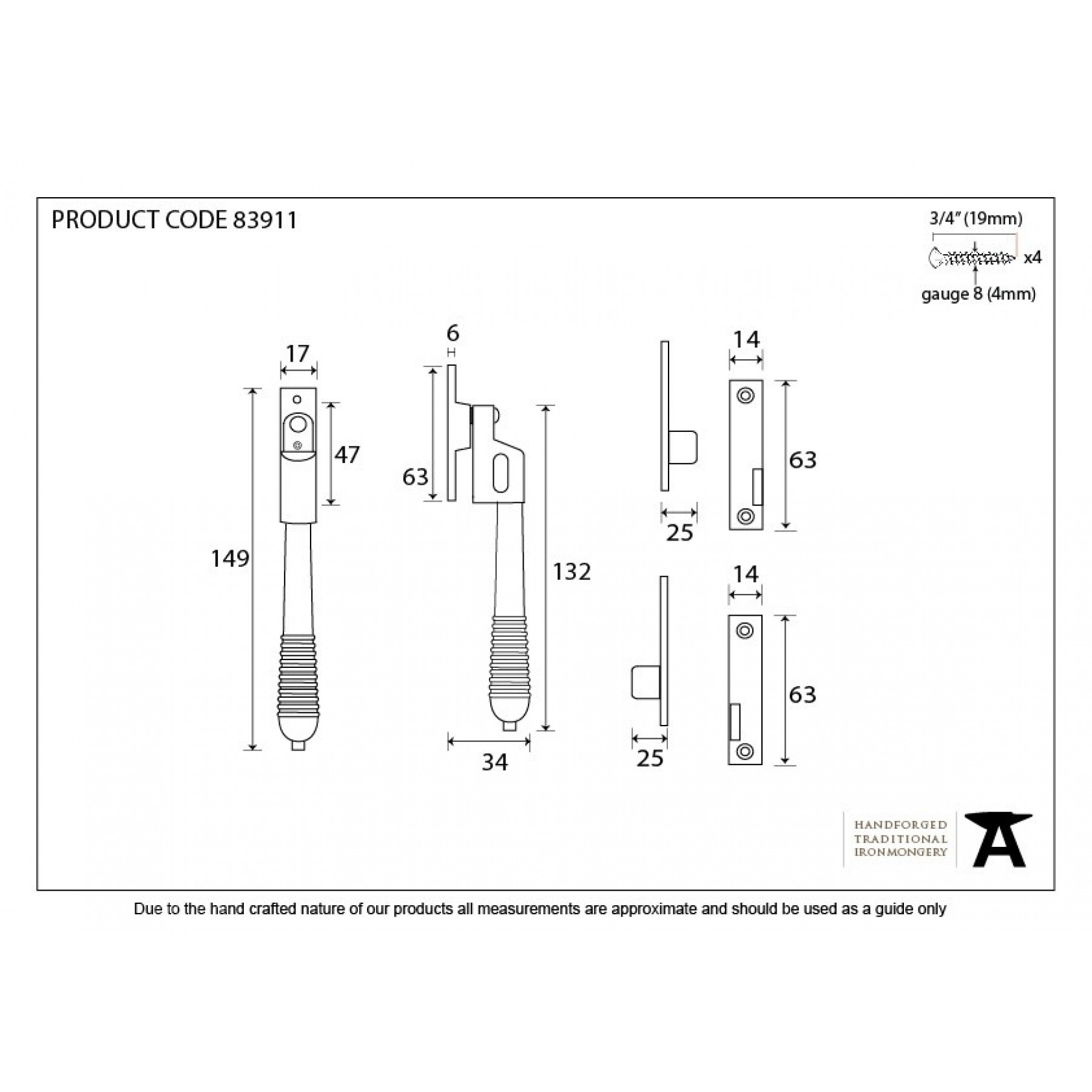 A classic regency style handle designed to offer security whilst providing some ventilation. It is night venting and can therefore be locked in both the open and shut positions. The design matches the reeded stays and door handles in Anvil's range and is made from solid brass with a stylish reeded end. The fastener has a locking mechanism by way of grub screw and comes supplied with two receiver or keep plates for both left and right handed windows. Sold with key and fixing screws.